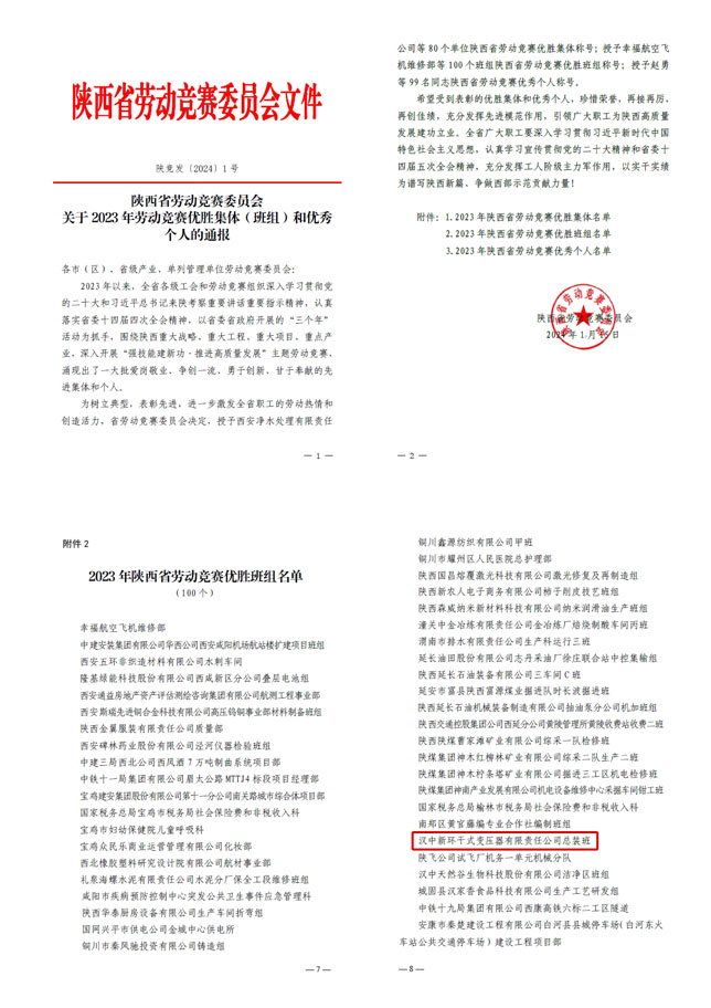 2024年1月15日,陕西省劳动竞赛委员会发布2023年度“强技能建新功·推进高质量发展”主题劳动竞赛评比结果,我公司总装班荣获“2023年陕西省劳动竞赛优胜班组”荣誉称号。